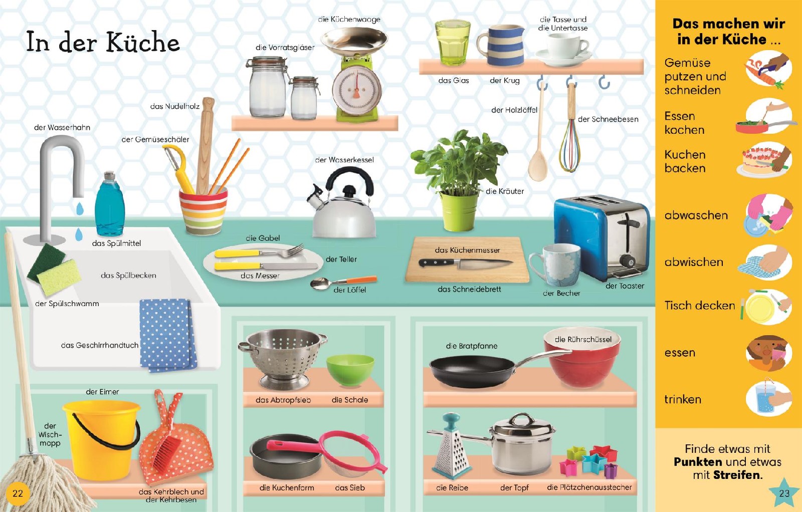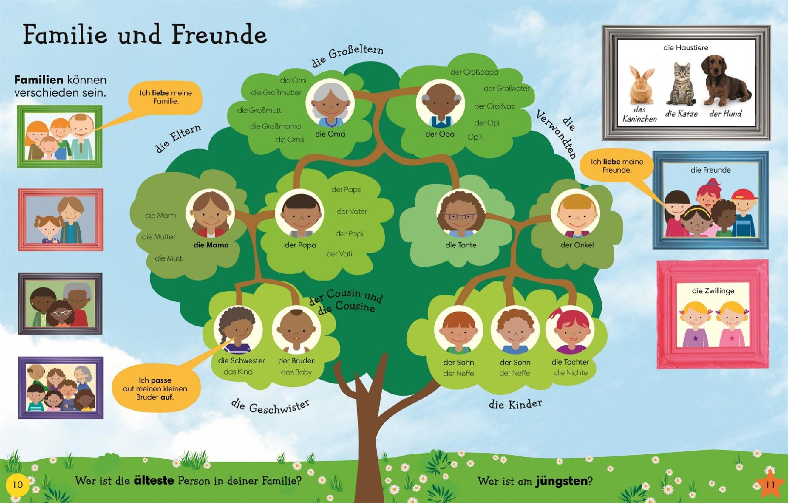 1.000 Wörter – 1.000 Bilder: Buntes Bilderbuch zur Sprachförderung! Die aufregende Tierwelt, spannende Fahrzeuge, bunte Kleidung an der Wäscheleine – es gibt so viel zu entdecken in der kindlichen Alltagswelt! Dieses prall gefüllte Bildwörterbuch hilft Kleinkindern ab 3 Jahren mit 1.000 Fotos und Illustrationen aus rund 20 Themenbereichen beim Spracherwerb. Einfache Geschichten und Fragen vermitteln einen vielseitigen und altersgerechten Wortschatz. Spielerische Sprachentwicklung im Kindergarten mit dem farbenfroh illustrierten Bildlexikon: • Altersgerechtes Lernen mit den wichtigsten 1.000 Substantive, Verben und Adjektive aus dem Grundwortschatz für Kinder im Kindergartenalter. • Bilder aus dem kindlichen Alltag animieren zum Mitsprechen. • In einfachen, liebevollen Geschichten werden die Wörter in ganzen Sätzen verwendet und in Zusammenhang gesetzt. • Motivierende Fragen bieten Gesprächsanlässe und fördern die Interaktion mit den Eltern oder Erziehern. Wort für Wort und Bild für Bild sprechen lernen: Entdecken Sie mit den Kleinen die bunte Alltagswelt und fördern Sie spielerisch die kindliche Sprachentwicklung!