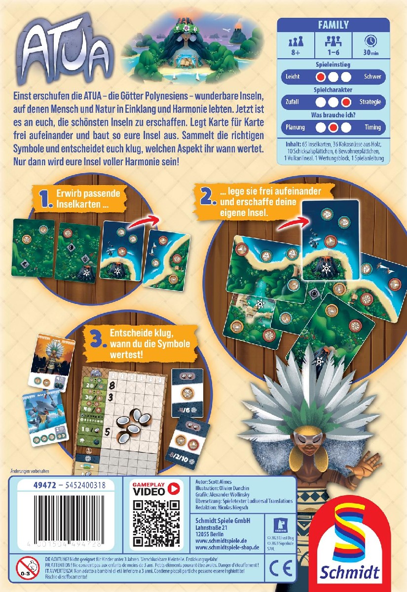 Einst erschufen die Atua, die Götter Polynesiens, wunderbare Inseln, auf denen Mensch und Natur in Einklang und Harmonie lebten. Jetzt ist es an euch, die schönsten Inseln zu erschaffen. Legt Karte für Karte, ganz individuell mit beliebiger Ausrichtung aufeinander und baut so eure Insel aus. Sammelt die richtigen Symbole und entscheidet euch klug, welchen Aspekt ihr wann wertet. Nur dann wird eure Insel voller Harmonie sein!