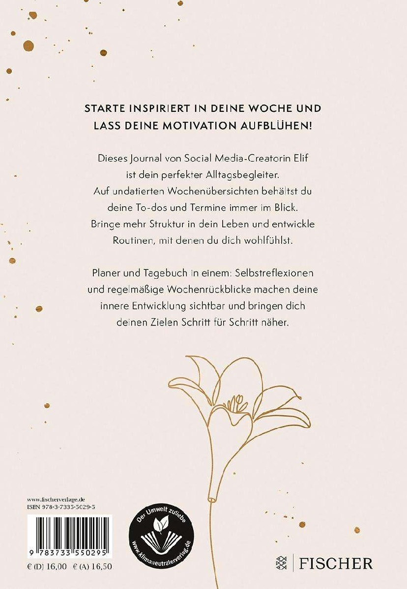 Mit knapp 900.000 Follower:innen gehört Elif zu den erfolgreichsten TikToker:innen im deutschsprachigen Raum. Der immerwährende Jahresplaner ist das ideale Fanbuch und überzeugt mit einer hochwertigen Ausstattung und praktischen Journalelementen. Für alle, die mehr Struktur und Achtsamkeit in ihr Leben bringen wollen: Neben klassischen Wochenübersichten und Checklisten bietet der Kalender jede Menge Platz für regelmäßige Reflexionen und Monatsrückblicke. Habit Tracker, motivierende Sprüche und Tipps von To Do-Listen-Liebhaberin Elif machen den Kalender zu einem unentbehrlichen Alltagsbegleiter für junge Erwachsene!