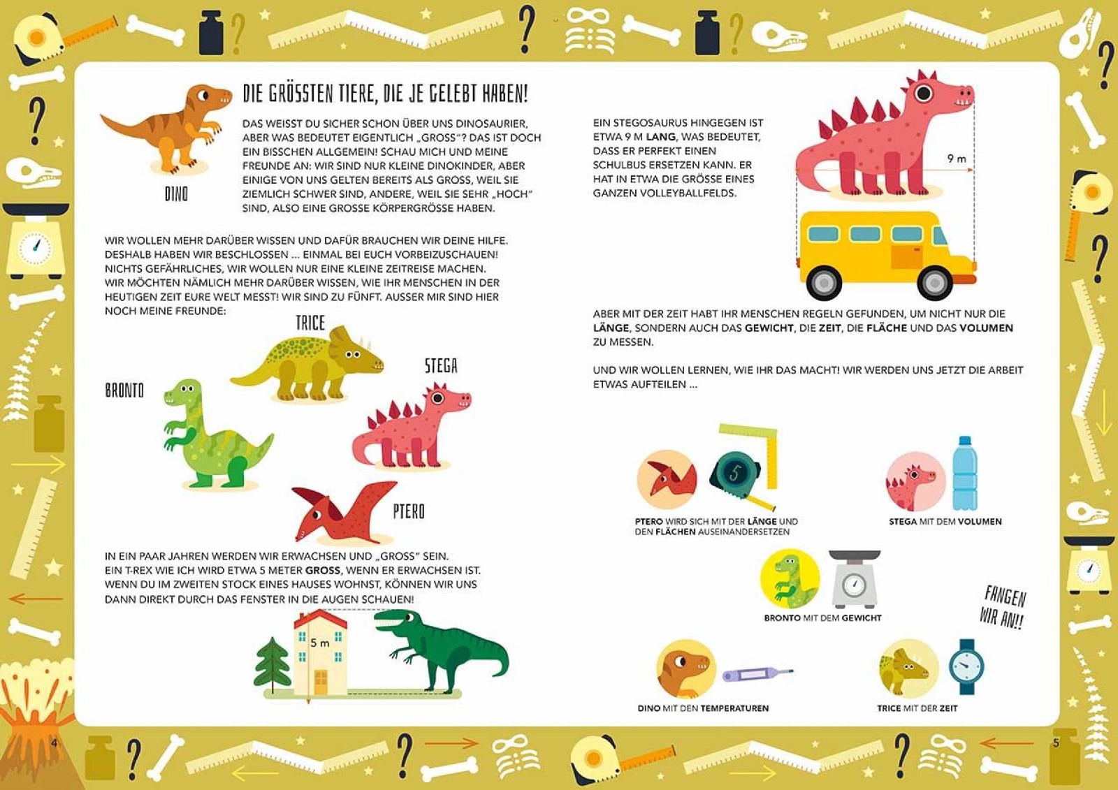 Wer wiegt halb so viel wie ein Bus? Der Ankylosaurus. Wessen Hals war so lang wie eine Rolltreppe? Das war der Brachiosaurus. Und in welches Saurierei passten drei Flaschen Milch? Ins Ei des Hypselosaurus. Bei Spielen und spannenden Aufgaben im Dino-Park entdeckst du Maßeinheiten wie Länge, Fläche, Volumen und Gewicht und wie du diese Größen kinderleicht umwandelst oder vergleichst.