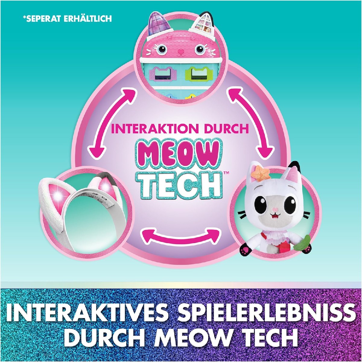 Mit dem interaktiven Miau-tastischen Katzenohren-Haarreif aus Gabby’s Dollhouse: The Movie können Kinder in Gabbys magische Welt eintauchen! Der ca. 16,5?cm hohe Haarreif sieht genauso aus wie Gabbys ikonische Katzenohren und ist ideal für fantasievolle Rollenspiele. Über 20 Geräuscheffekte, Lichtelemente und bewegungsgesteuerter Sound sorgen für katz-tastischen Spielspaß. Durch Drücken der linken oder rechten Ohren lassen sich drei verschiedene Spielmodi aktivieren: Dance Party, Gabby Modus oder Kitty Modus. Dank der innovativen Meow Tech-Technologie lässt sich der Haarreif sogar mit dem Meow-tastischen interaktiven Puppenhaus und dem interaktiven Panda Pfötchen Plüsch zum Kinofilm verbinden – für ein ganz besonderes interaktives Erlebnis (jeweils separat erhältlich). Ob zum Geburtstag, zu Weihnachten oder für kreative Verkleidungsspiele zwischendurch – der Haarreif ist das perfekte Geschenk für kleine Gabby-Fans ab 3 Jahren.