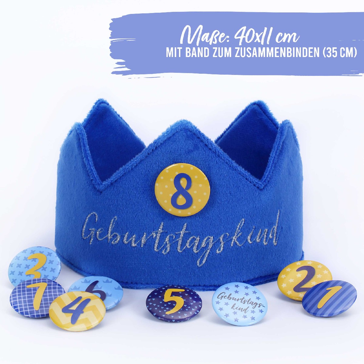 Das ideale Geburtstags Accessoire sollte auf keinem Geburtstag fehlen. Dein Kind wird sich über den angenehmen Samtstoff freuen, denn dieser ist sehr kuschelig und passt sich wunderbar der Kopfform an. Außerdem kannst du die Krone mit dem Band individuell binden. Die Geburtstagskrone ist 40cm lang x 11cm hoch mit einer hochwertigen Bestickung ("Geburtstagskind") versehen. Die Buttons mit einem Durchmesser von 35 mm können bis zu dem achten Geburtstag ausgetauscht werden. So kaufst du auch ein Produkt, dass langlebig und ressourcenschonend ist, zudem schont es auch deinen Geldbeutel. Die Krone ist in verschiedenen Farben erhältlich: rosa, pink, türkis, blau und in grau. Zusätzlich bieten wir auch farblich passende Wimpelketten für deine Party an, schau einfach mal im Shop vorbei!Lieferumfang: • 1 Krone aus Samt mit Band • 9 Buttons - Zahlen von 1-8 sowie ein Button mit der Aufschrift "Geburtstagskind"