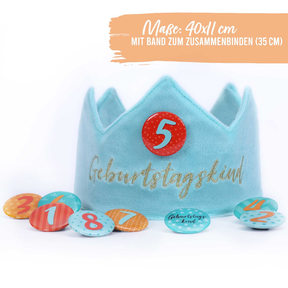 Das ideale Geburtstags Accessoire sollte auf keinem Geburtstag fehlen. Dein Kind wird sich über den angenehmen Samtstoff freuen, denn dieser ist sehr kuschelig und passt sich wunderbar der Kopfform an. Außerdem kannst du die Krone mit dem Band individuell binden. Die Geburtstagskrone ist 40cm lang x 11cm hoch mit einer hochwertigen Bestickung ("Geburtstagskind") versehen. Die Buttons mit einem Durchmesser von 35 mm können bis zu dem achten Geburtstag ausgetauscht werden. So kaufst du auch ein Produkt, dass langlebig und ressourcenschonend ist, zudem schont es auch deinen Geldbeutel. Die Krone ist in verschiedenen Farben erhältlich: rosa, pink, türkis, blau und in grau. Zusätzlich bieten wir auch farblich passende Wimpelketten für deine Party an, schau einfach mal im Shop vorbei!Lieferumfang: • 1 Krone aus Samt mit Band • 9 Buttons - Zahlen von 1-8 sowie ein Button mit der Aufschrift "Geburtstagskind"