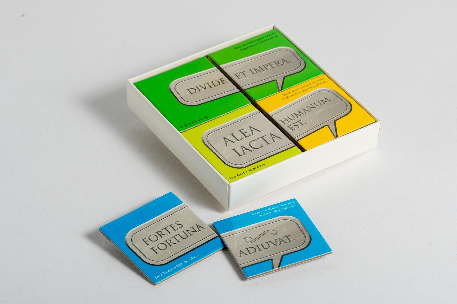 Viele Lebensweisheiten der alten Römer sind uns noch heute geläufig und werden von Schlaumeiern gerne zu jeder Gelegenheit zitiert. So spricht der Römer am Morgen »Carpe diem!« und geht tatkräftig zu Werke, kommentiert Fehleinschätzungen mit »Errare humanum est« und philosophiert am Ende des Tages beim fröhlichen Zechen »In vino veritas«. Nach dem Prinzip eines Merkspiels müssen zwei Spielkarten aufgedeckt werden, die eine lateinische Weisheit ergeben. Durch die beigefügte Übersetzung erfährt der Laie, was er sagt.
