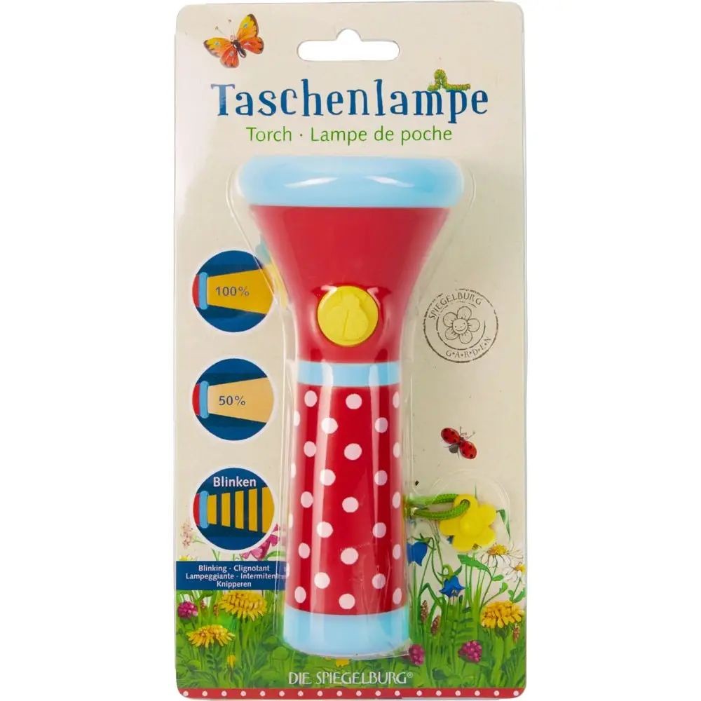 Diese LED-Lampe ist unentbehrlich bei allen Streifzügen durch Feld, Wald und das nächtliche Kinderzimmer. Die Taschenlampe hat 3 Leuchtmodi: volle Leuchtkraft, 50% Leuchtkraft, Blinken. Die neuentwickelte, kindgerechte Form mit gummierter Oberfläche sorgt für einen sicheren Halt und ist einfach zu handhaben. Die praktische Halteschlaufe mit süßem Dekoanhänger in Blumenform rundet das Gesamtpaket der Taschenlampe ab. Batterien (3 x AAA) nicht enthalten.