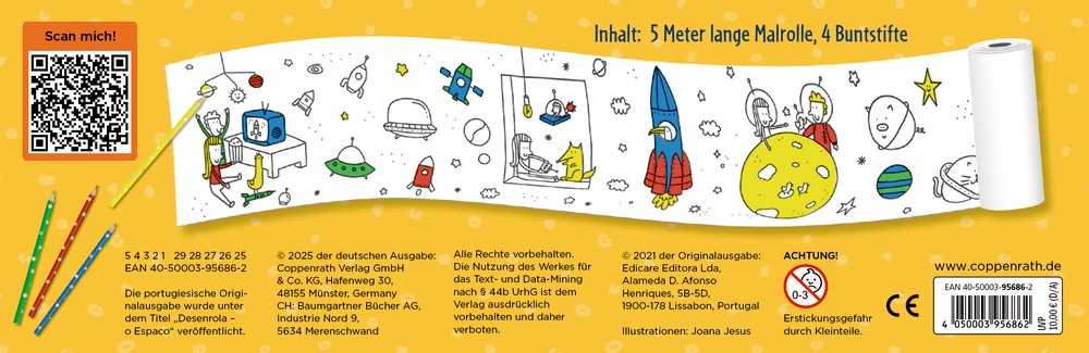 Die stabile und lustig gestaltete Schachtel enthält eine 5 Meter lange Malrolle mit einer fortlaufenden Szene ohne Wiederholungen. 4 Buntstifte in den Grundfarben sind gleich mit dabei. Unendlicher Malspaß für 1 Kind allein oder eine ganze Geburtstagsgesellschaft.