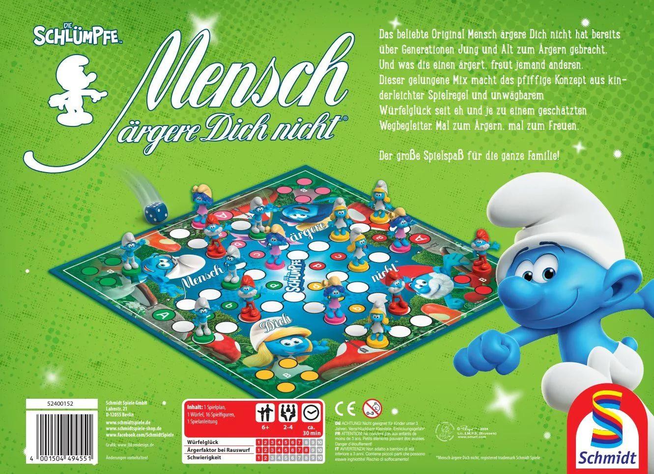 Das beliebte Original Mensch ärgere Dich nicht® hat bereits über Generationen Jung und Alt zum Ärgern gebracht. Und was die einen ärgert, freut jemand anderen. Dieser gelungene Mix macht das pfiffige Konzept aus kinderleichter Spielregel und unwägbarem Würfelglück seit eh und je zu einem geschätzten Wegbegleiter. Mal zum Ärgern, mal zum Freuen. Der große Spielspaß für die ganze Familie! Hier als Schlumpferlebnis mit 16 schönen 3D-Spielfiguren.