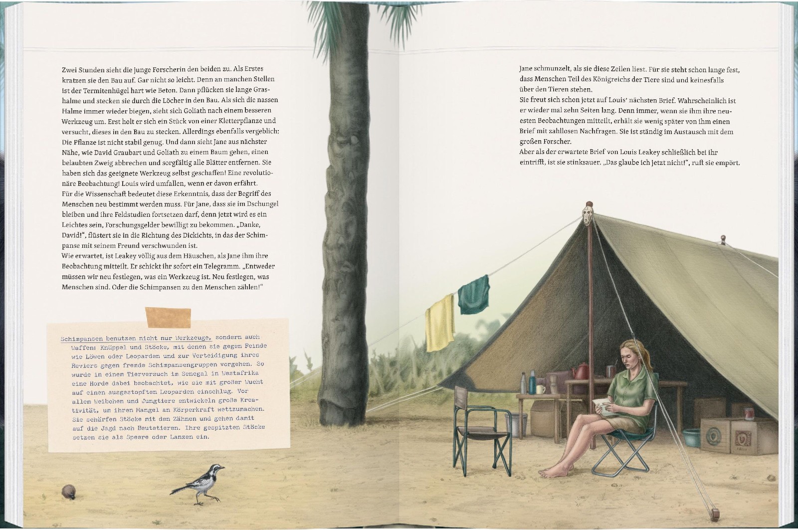 Jane Goodall, die berühmteste Primatenforscherin der Welt, hat schon als Kind davon geträumt, einmal wie Tarzan im Dschungel zu leben und den Wildtieren dort ganz nah zu sein. Und sie hat diesen Traum wahr gemacht! Als junge Frau bekommt sie die Chance, im Gombe-Stream-Nationalpark von Tansania eine Gruppe wilder Schimpansen zu beobachten. Sie macht Entdeckungen wie noch kein Forscher vor ihr. Wohl kaum jemand sonst kommt unseren haarigen Verwandten so nah wie sie! Die fesselnd erzählte Geschichte und die naturalistischen, mit viel Atmosphäre gestalteten Illustrationen lassen schon Grundschulkinder den Dschungel und seine Bewohner mit den Augen der jungen Forscherin sehen.