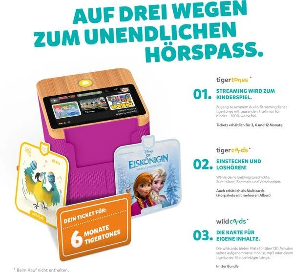 Kindgerechtes Audio-Streaming: Tausende Hörspiele, Hörbücher und Musik nur für Kinder in tigertones (Audio-Streamingdienst). Verbunden mit der tigerbox TOUCH PLUS, können alle Inhalte direkt über die Box abgerufen werden, ganz ohne Smartphone.