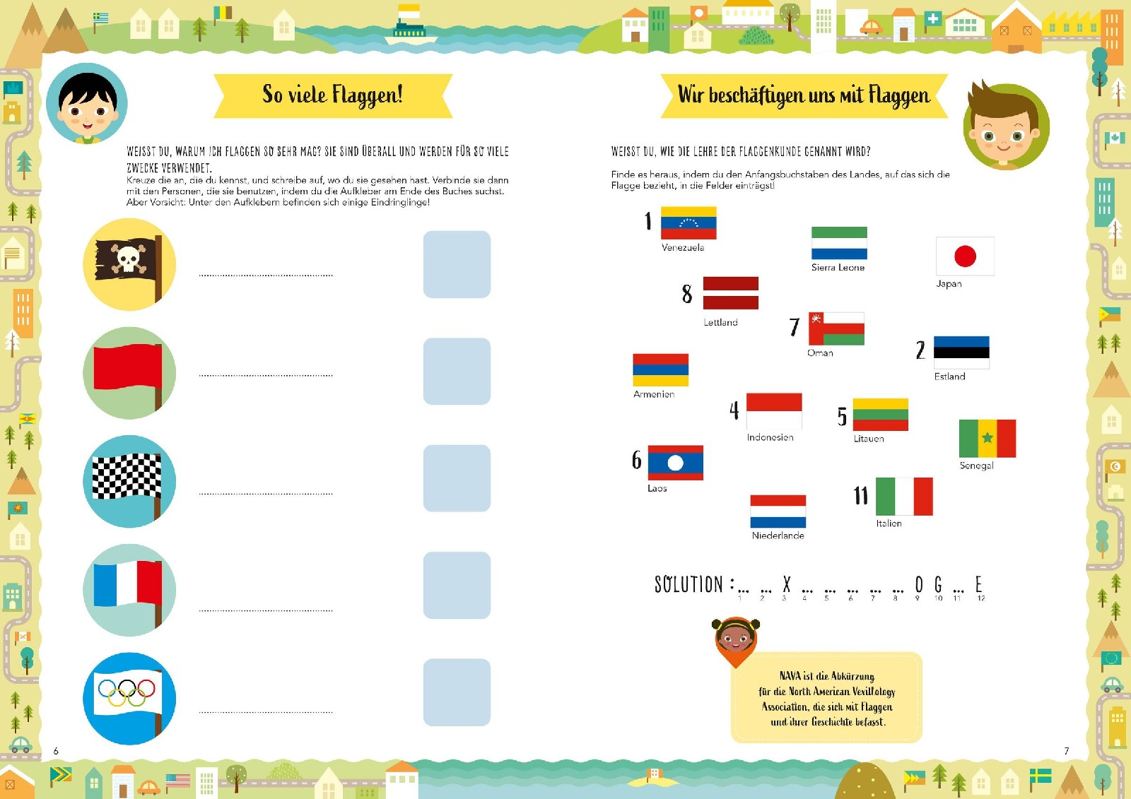 Eine Flagge ist nicht nur ein Stück Stoff mit Zeichen darauf wie Streifen, Tiere, Rauten, Monde ... eine Flagge steht auch für die Kultur und Geschichte eines Landes. Die Farben- und Formenvielfalt ist groß. Begleite die Freunde Gea, Tom und Ben durch diese bunte Welt. In diesem Aktivitätsbuch entdeckst du ihre Anfänge in der Ritterzeit, lernst alles über Symbolik, Botschaft und Verwendung. Du entdeckst jede Menge knifflige Spiele und Aufgaben rund um Flaggen, Banner und Fahnen: ein Flaggen-Sudoku, das Flaggen-Alphabet, um mit Schiffen auf See zu kommunizieren, und natürlich die fünf Gestaltungsprinzipien, mit deren Hilfe du richtige Flaggen selbst gestaltest.