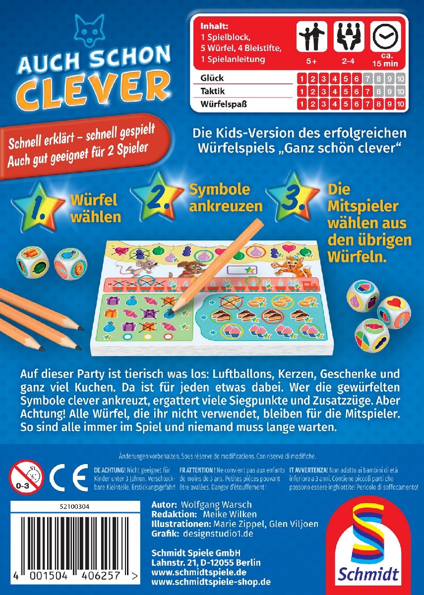 Auf dieser Party ist tierisch was los: Luftballons, Kerzen, Geschenke und ganz viel Kuchen. Da ist für jeden etwas dabei. Wer die gewürfelten Symbole clever ankreuzt, ergattert viele Siegpunkte und Zusatzzüge. Aber Achtung! Alle Würfel, die ihr nicht verwendet, bleiben für die Mitspieler. So sind alle immer im Spiel und niemand muss lange warten.