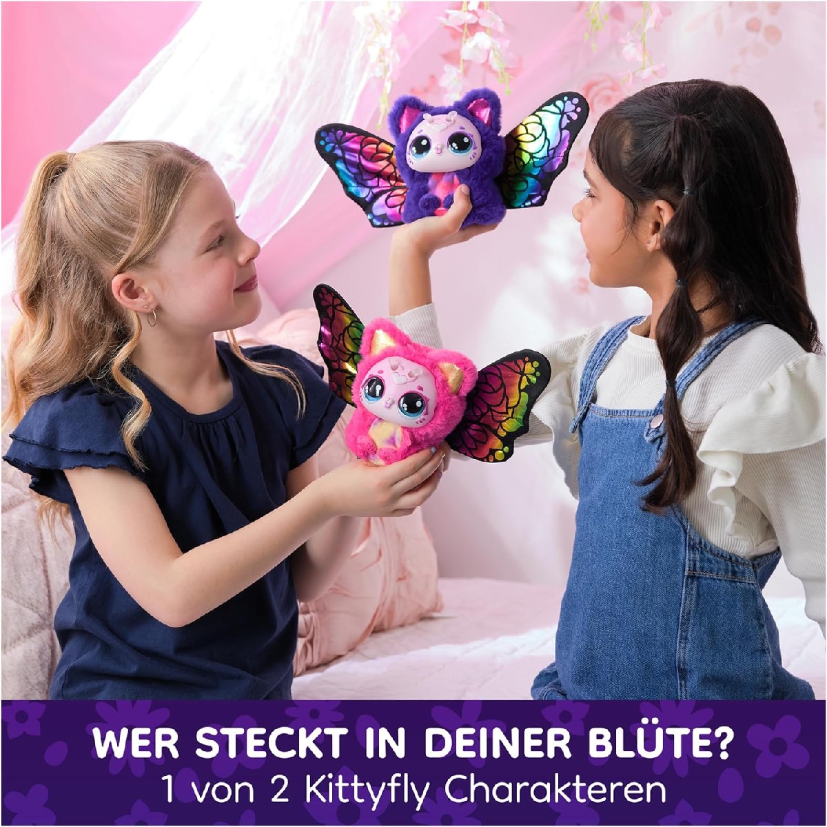 Jetzt wird’s zauberhaft: mit den Bloomables, den magischen Kreaturen aus Hatchtopia. Alles beginnt mit einer Blüte. Gießt man sie, leuchten magische Lichter auf und Geräusche erklingen – und die Blume öffnet sich. Zum Vorschein kommt ein süßer Hatchipillar, der mit Liebe großgezogen wird: Spielen, Füttern, Kitzeln oder Kuscheln. Ist er bereit, verwandelt er sich in eine von zwei Kittyflys – welche, bleibt eine Überraschung. Ist es Rosy in Pink oder Violet in Lila? Beide sehen zuckersüß aus, sind aus weichem Plüsch und besitzen bunt glitzernde Regenbogenflügel. Langweilig wird es mit keinem der Beiden: mit über 100 Geräuschen und Reaktionen, Singen, Musik spielen oder sogar Wahrsagen sind die Spielmöglichkeiten unbegrenzt. Das Aufblühen und die Verwandlung können beliebig oft wiederholt werden. Für noch mehr Spaß ist von Spin Master auch das Puppyfly separat erhältlich.