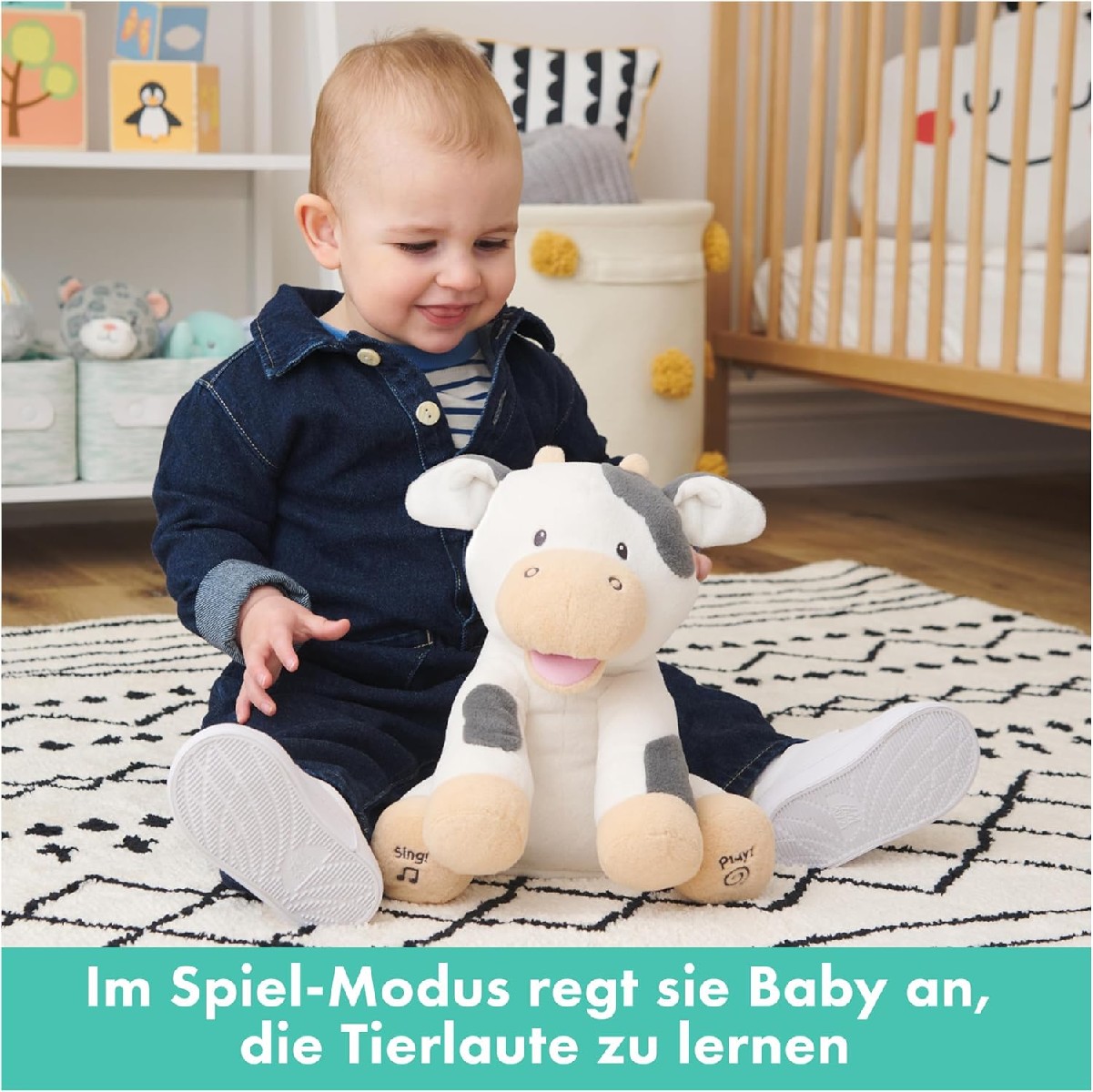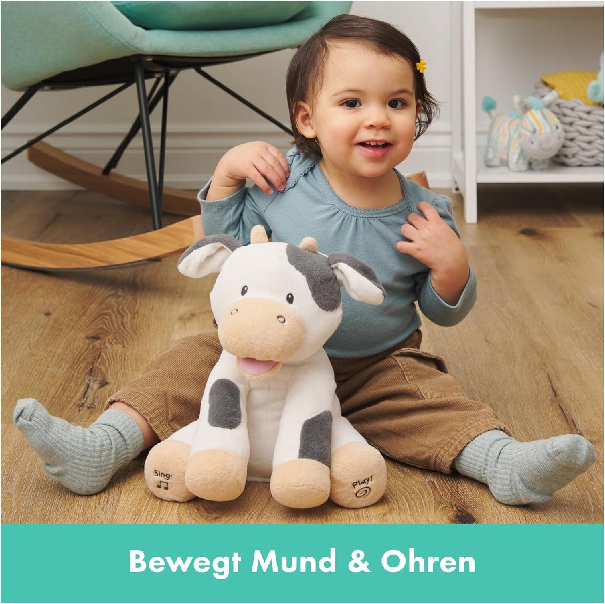 Babys und Kleinkinder lieben Musik und Gesang, besonders dann, wenn Kinder für sie singen. Daher ist Buttermilch, die Kuh, des Traditionsherstellers GUND ideal für die Kleinsten, denn sie singt mit niedlicher Kinderstimme Old MacDonald hat ne Farm. Dazu bewegt sie Mund und Ohren. Im Spiel-Modus spricht sie das Kind sogar direkt an und animiert es, Tierlaute zu lernen, mitzumachen und auszuprobieren. Zusammen mit Mama oder Papa, Oma oder Opa machen selbst die Jüngsten schon mit. Ältere Kleinkinder können die Kuh durch Drücken der Füße selbst aktivieren und freuen sich über dieses Erfolgserlebnis. Sie lernen spielerisch den Liedtext und singen bald gemeinsam mit Buttermilch. Die Firma GUND legt seit mehr als 120 Jahren wert auf Qualität, kindgerechtes Design und altersgerechte Funktionen. Da kleine Kinder oft nicht zimperlich mit ihren Lieblingstieren umgehen, ist Buttermilch trotz ihrer Funktionen robust genug, um groben Umgang zu verzeihen. Da Lieblingstiere immer und überall dabei sein müssen, bleiben Flecken und Verschmutzungen nicht aus. Diese lassen sich mit einem feuchten Tuch einfach abwischen. Das GUND Portfolio bietet neben der interaktiven Kuh auch Flappy, den singenden Elefanten und Flora, das Häschen. Außerdem gibt es Tiere aus 100% recyceltem Material für Kuscheln mit grünem Gewissen.