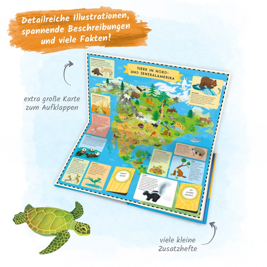 Tauchen wir ein in die faszinierende Welt der Tiere: Was macht das Opossum, wenn es in Gefahr ist? Legt ein Schnabeltier wirklich Eier? Und wie sehen Flugdrache, Mondfisch oder Wombat aus? Dieser wundervoll illustrierte Atlas hat auf diese und viele weitere Fragen Antworten. Große Aufklappseiten und Extra-Heftchen bergen viele Fakten und Wissenswertes über die Tiere der Welt, ihre Verhaltensweisen und Lebensräume. Ein toller Atlas für Tierfreunde und kleine Weltenbummler!