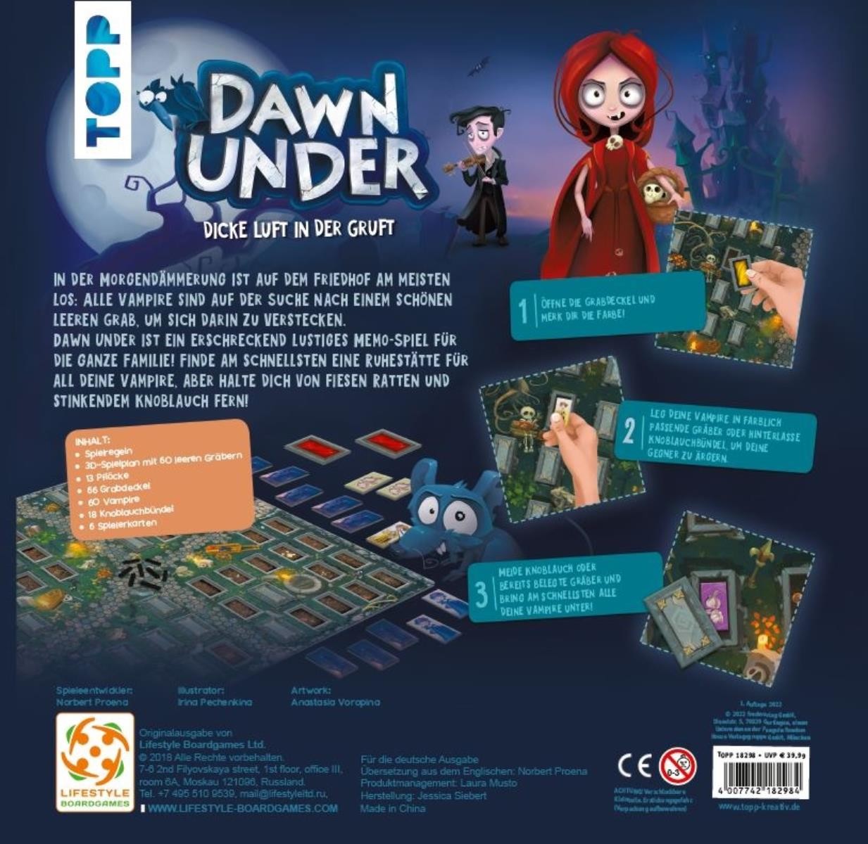In der Morgendämmerung ist auf dem Friedhof am meisten los: Jeder Vampir der Stadt ist auf der Suche nach einem schönen leeren Grab, in dem er sich verstecken kann. Dawn Under ist ein erschreckend lustiges Memo-Spiel für die ganze Familie! Sei der Erste, der eine Ruhestätte für all seine Vampire findet, aber halte dich von fiesen Ratten und stinkendem Knoblauch fern! 2–6 Personen | Ab 6 Jahren | 20-30 Minuten Spielzeit