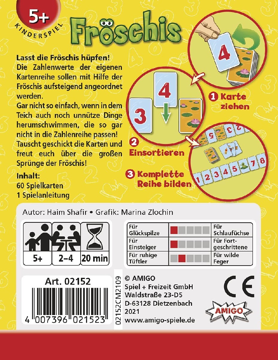 Lasst die Fröschis hüpfen! Die Zahlenwerte der eigenen Kartenreihe sollen mit Hilfe der Fröschis aufsteigend angeordnet werden. Gar nicht so einfach, wenn in dem Teich auch noch unnütze Dinge herumschwimmen, die so gar nicht in die Zahlenreihe passen! Tauscht geschickt die Karten und freut euch über die großen Sprünge der Fröschis! Ein Kinderkartenspiel ohne komplizierte Regeln aus der Ideenschmiede des Halli Galli-Autors Haim Shafir.