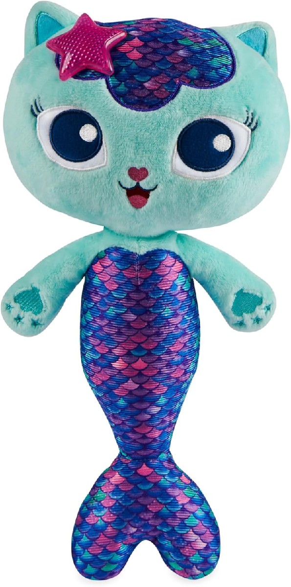 Die DreamWorks Gabby's Dollhouse Spielzeuge von Spin Master lassen Vorschulkinder in eine fantasievolle Welt voller Möglichkeiten eintauchen. Mit dem sprechenden Meerkätzchen aus Gabby‘s Dollhouse bereit machen für endloses Umarmen und Kuscheln. Mit diesem weichen und knuddeligen, 33cm großen Plüschkätzchen erwacht Gabbys Freundin aus der Serie zum Leben. Mit ihren spitzen Ohren, ihrer entzückenden Meerjungfrauenflosse, den gestickten Details und einem leuchtenden Seestern auf ihrem Kopf ist das sprechende Meerkätzchen (nur englisch) der ideale Begleiter für Abenteuer in der Freizeit oder beim Schlafengehen. Das sprechende Meerkätzchen beherrscht mehrere Geräuscheffekte und englische Sätze. Einfach den Bauch von Meerkätzchen gedrückt halten und zusehen, wie der Seestern aufleuchtet und katz-tastische Geräuscheffekte aus der Serie erklingen. Mit dem niedlichen Meerkätzchen-Stofftier an ihrer Seite können Kinder sich immer wieder spannende Abenteuer ausdenken. Gabby's Dollhouse-Spielzeug ist das ideale Geschenk für Kinder, die Fans der beliebten Netflix-Serie sind und gerne Puppenhauswelten nachbauen. Mit einer Auswahl aus liebenswerten Katzenfiguren, Zubehörteilen und Puppenhausmöbeln können Kinder ab 3 Jahren ihre ganz eigene Gabby's Dollouse Welt zuhause lebendig werden lassen. Von Spin Master gibt es viele weitere Gabby's Dollhouse Spielzeuge, wie das Partyzimmer Spielset, das das Puppenhaus mit einem Skate-Park um ein Dachgeschoss erweitert oder weitere niedliche Deluxe Räume (alles separat erhältlich), die in das Puppenhaus eingeschoben werden können und die Spielwelt erweitern.