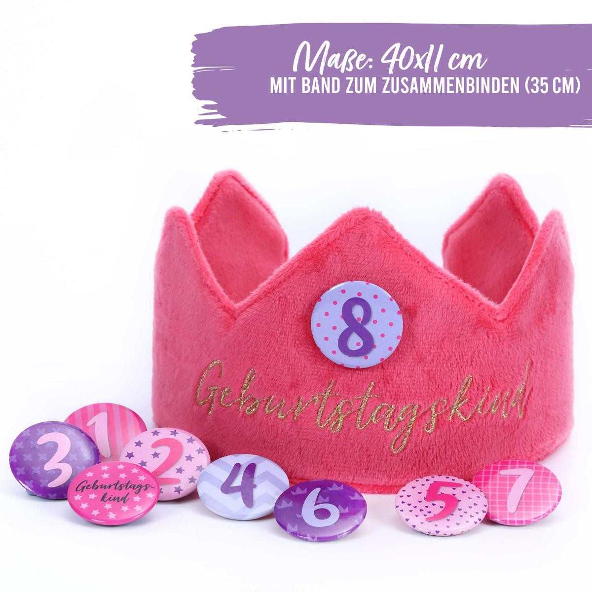 Das ideale Geburtstags Accessoire sollte auf keinem Geburtstag fehlen. Dein Kind wird sich über den angenehmen Samtstoff freuen, denn dieser ist sehr kuschelig und passt sich wunderbar der Kopfform an. Außerdem kannst du die Krone mit dem Band individuell binden. Die Geburtstagskrone ist 40cm lang x 11cm hoch mit einer hochwertigen Bestickung ("Geburtstagskind") versehen. Die Buttons mit einem Durchmesser von 35 mm können bis zu dem achten Geburtstag ausgetauscht werden. So kaufst du auch ein Produkt, dass langlebig und ressourcenschonend ist, zudem schont es auch deinen Geldbeutel. Die Krone ist in verschiedenen Farben erhältlich: rosa, pink, türkis, blau und in grau. Zusätzlich bieten wir auch farblich passende Wimpelketten für deine Party an, schau einfach mal im Shop vorbei!Lieferumfang: • 1 Krone aus Samt mit Band • 9 Buttons - Zahlen von 1-8 sowie ein Button mit der Aufschrift "Geburtstagskind"