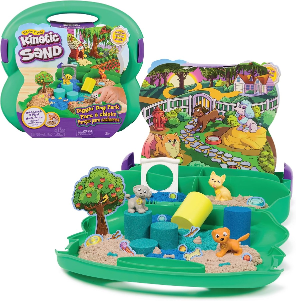 Das Köfferchen aufklappen, den Park gestalten und dann sind die Hunde los! Natürlich haben sie jede Menge Spaß und hinterlassen Spuren und mehr. Drei niedliche Hunde entdecken. Jede Welpe besitzt eine Sandspielfunktion – Pfotenabdrücke, Häufchen und mehr formen. Einen Hundepark mit 2 Werkzeugen gestalten. Inhalt: * Koffer * 680g Kinetic Sand * 3 Hunde * 1 Werkzeug, 1 Förmchen * 2 Kulissen, Deko-Elemente