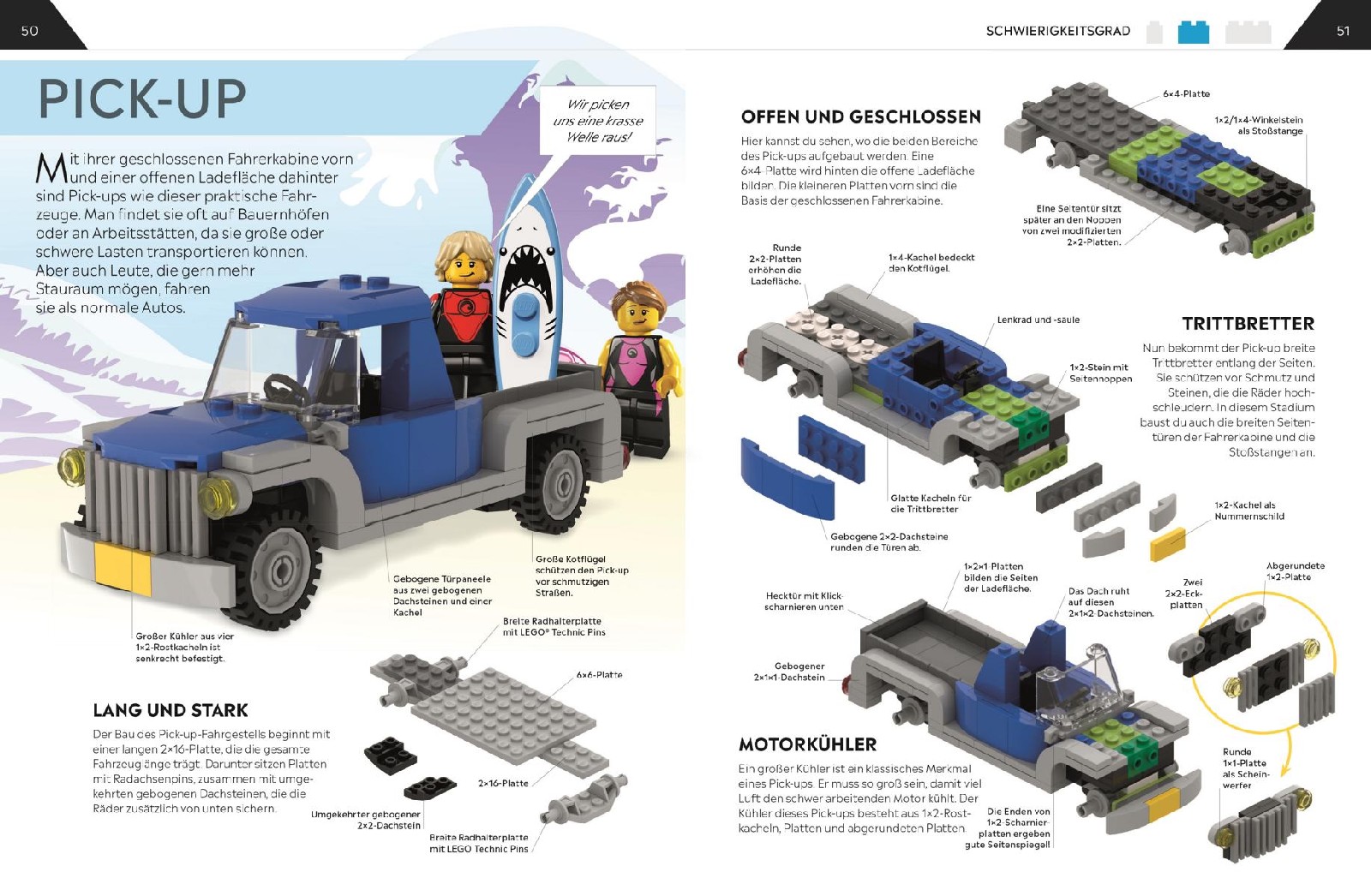 • Praktische Tipps & Techniken von erfahrenen LEGO® Baumeistern: Ob Fahrgestell, die Front, abgerundete Flächen oder Zusatzelemente – hilfreiche Tipps unterstützen beim Bauen einzelner Fahrzeugelemente.