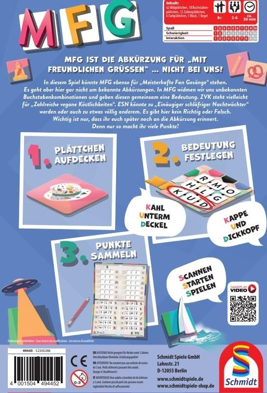 Keine Frage, alle kennen die Abkürzung MFG, aber in diesem Spiel könnte diese auch für etwas ganz anderes stehen! Zu lustigen Bildern werden hier möglichst merkbare Beschreibungen zu den 3 Buchstaben erfunden, welche dann am Ende des Spiels wieder in Erinnerung gerufen werden müssen – und dass nur anhand des Bildes. Je kreativer, desto einfacher lässt sich diese Aufgabe meistern!