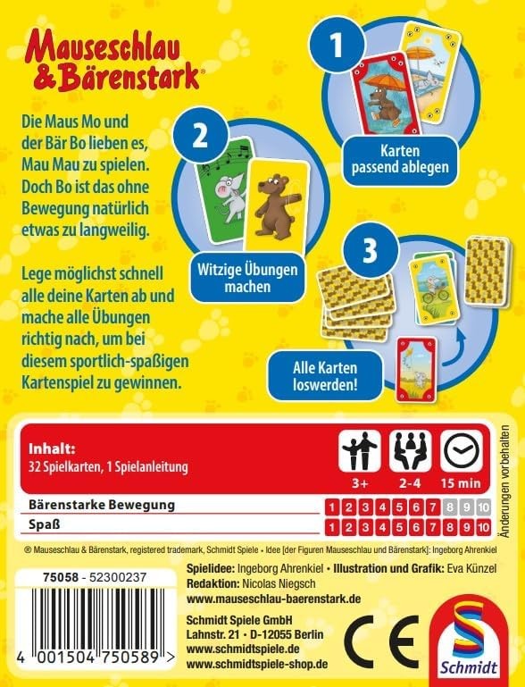 Die Maus Mo und der Bär Bo lieben es, Mau Mau zu spielen. Doch Bo ist das ohne Bewegung etwas zu langweilig. Ob du Grimassen schneidest, singst oder dich verbiegst: Lege möglichst schnell alle deine Karten ab und mache alle Übungen richtig nach, um bei diesem sportlich-spaßigen Kartenspiel zu gewinnen.