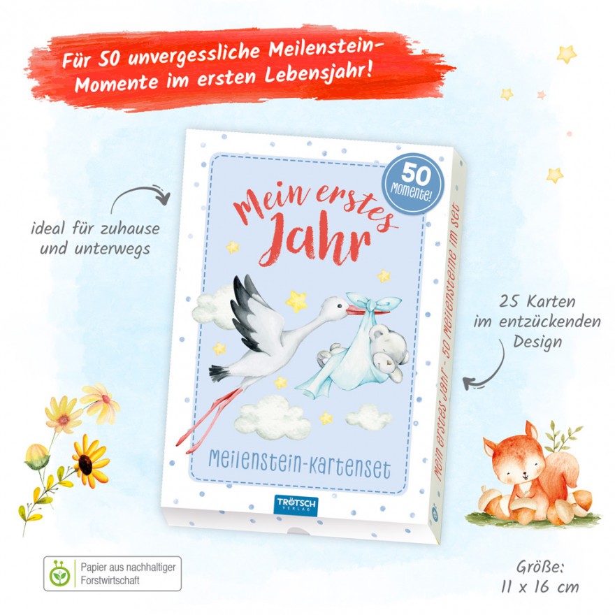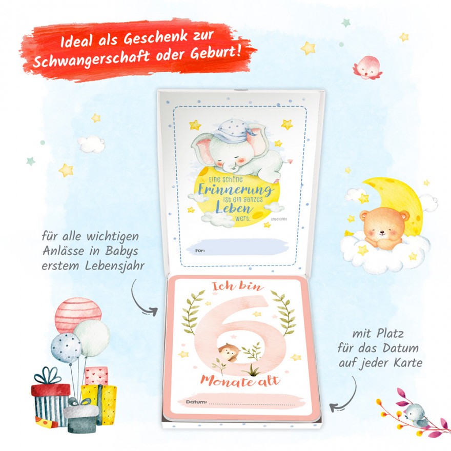 Im ersten Lebensjahr unserer kleinen Lieblinge gibt es viele Meilensteine – die erste Nacht durchgeschlafen, der erste Brei, die ersten wackeligen Schritte … So viele Momente, die man sich für immer bewahren möchte! Dieses liebevoll gestaltete Kartenset bietet für jeden Anlass das passende Motiv und lässt Erinnerungsfotos zu etwas ganz Besonderem werden. Das ideale Geschenk zur Schwangerschaft, Geburt oder Taufe!