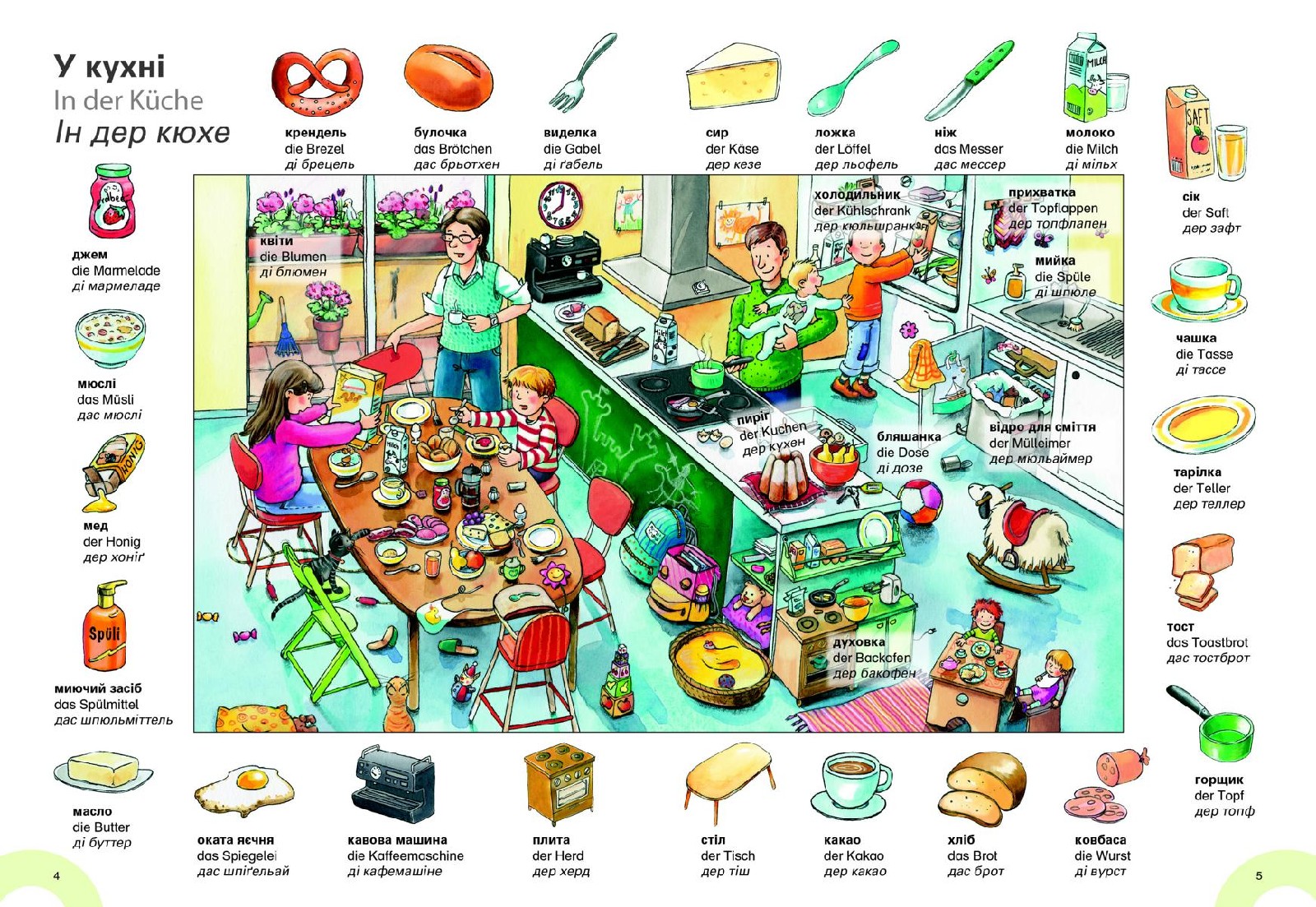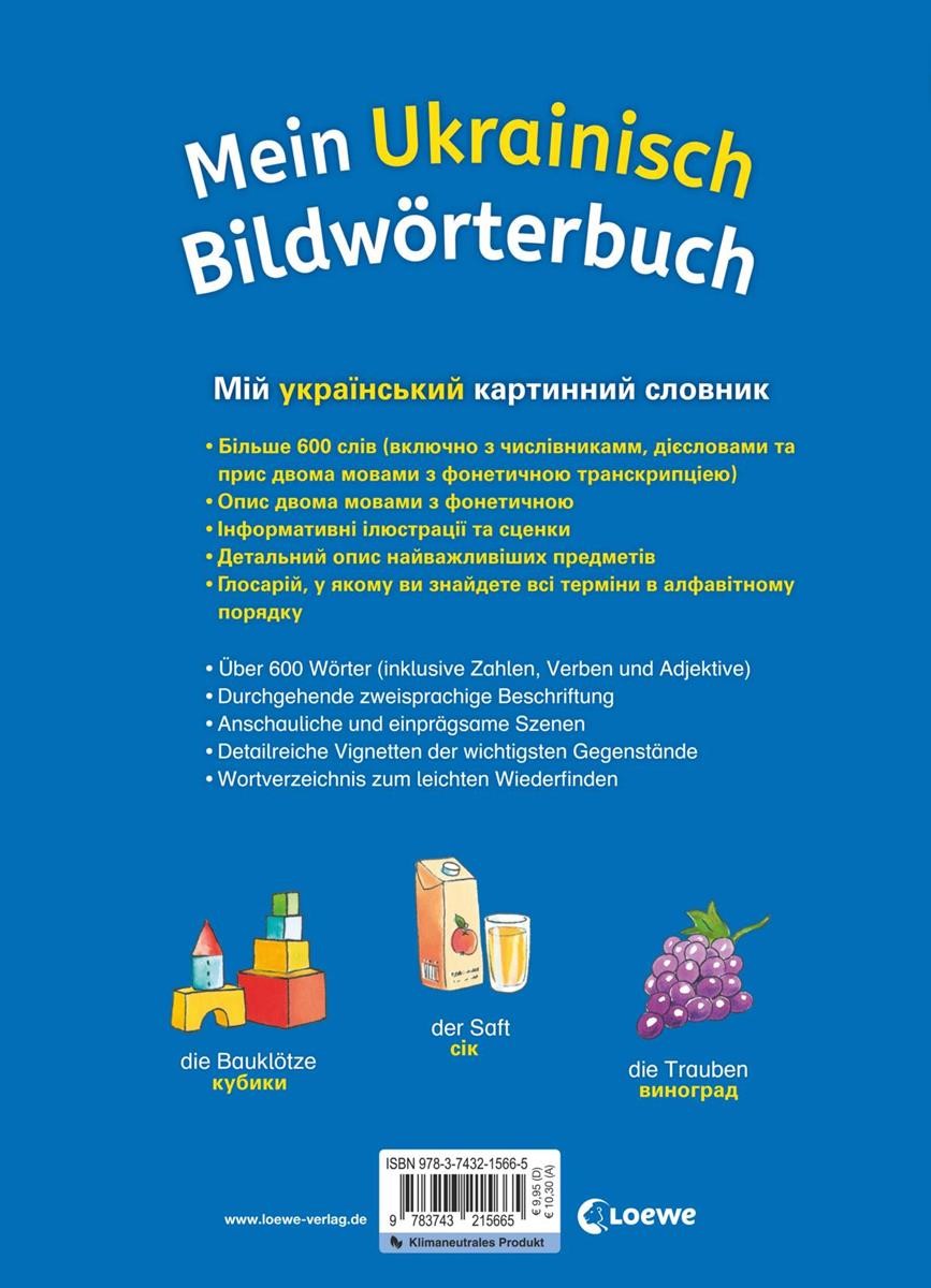 üSprachen lernen leicht gemacht ümit Aussprachehilfe üab 4 Jahre Fremdsprachenkenntnisse werden immer wichtiger, denn sich in einem neuen Land zurecht zu finden, fä llt viel leichter, wenn man die Sprache beherrscht und sich in Alltagssituationen verständigen kann. Gerade Kindern fällt das Erlernen einer neuen Sprache besonders leicht. Dies gilt vor allem, wenn das neue Wissen mit bereits vorhandenem verknü pft ut und in der eigenen Erfahrungswelt verankert werden kann. Dieses zweisprachige Bildwörterbuch vermittelt durch anschauliche Alltagsszenen und detailreiche Vignetten die wichtigsten Begriffe aus dem Kinderalltag und hilft, diese auch auf Deutsch oder Ukrainisch richtig zu benennen und anzuwenden. über 600 Wörter (inklusive Zahlen, Verbe und Adjektive) durchgehende zweisprachige Beschriftung anschauliche un deinprägsame Alltagssituationen detailreiche Bilder der wichtigsten Gegenstände