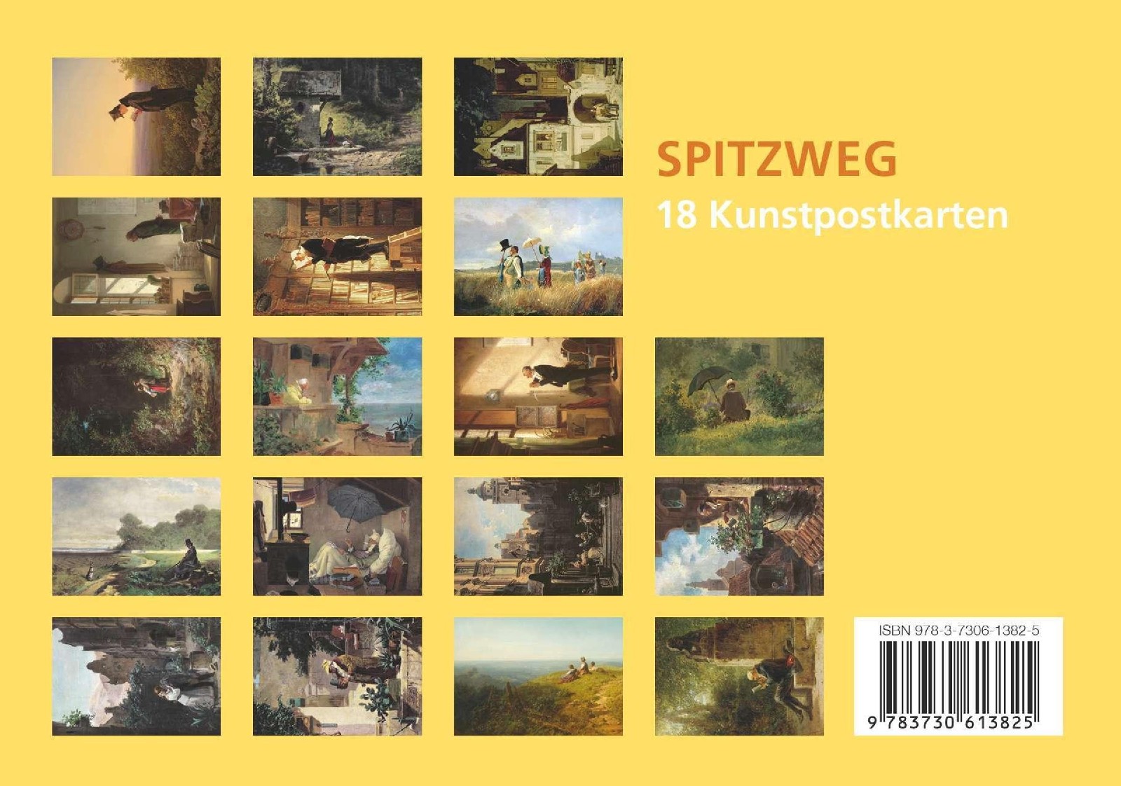 Der deutsche Maler Carl Spitzweg (1808–1885) ist bekannt für seinen pointierten Motive. Nach ersten Biedermeier-Themen öffnete sich der Maler anderen Stilrichtungen und schuf weit über 1000 Bilder und Zeichnungen. Bilder wie »Der arme Poet« oder »Der Bücherwurm« sind allen Kunst-Enthusiasten bekannt, aber auch spätere Landschaftsmalereien erfreuen sich großer Popularität. Dieses Postkarten-Set beinhaltet 18 ausgewählte Motive.