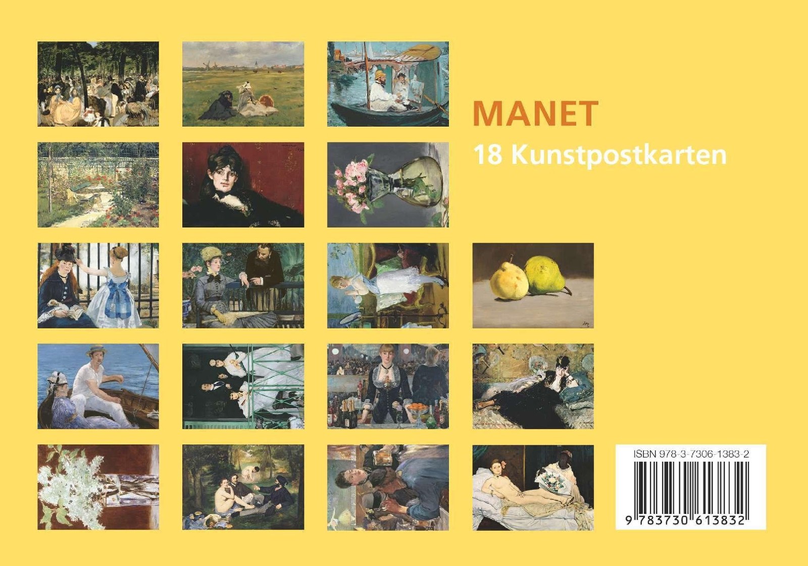Der französische Maler Édouard Manet (1832–1883) wurde erst nach seinem Tod als Maler anerkannt. Zahlreiche Bilder, die er bei großen Ausstellungen einreichte, stießen zuerst auf Ablehnung. Heute gilt er als Vorreiter des Impressionismus und der modernen Malerei. Schon zu Lebzeiten suchte er die Nähe zu anderen Künstlern und übte großen Einfluss auf Nachwuchsmaler aus. Er selbst ließ sich von spanischen Malern wie Velázques und Goya inspirieren. Mit 18 ausgewählten Bildern verschafft dieses Postkarten-Set einen Eindruck seines Schaffens und Könnens.