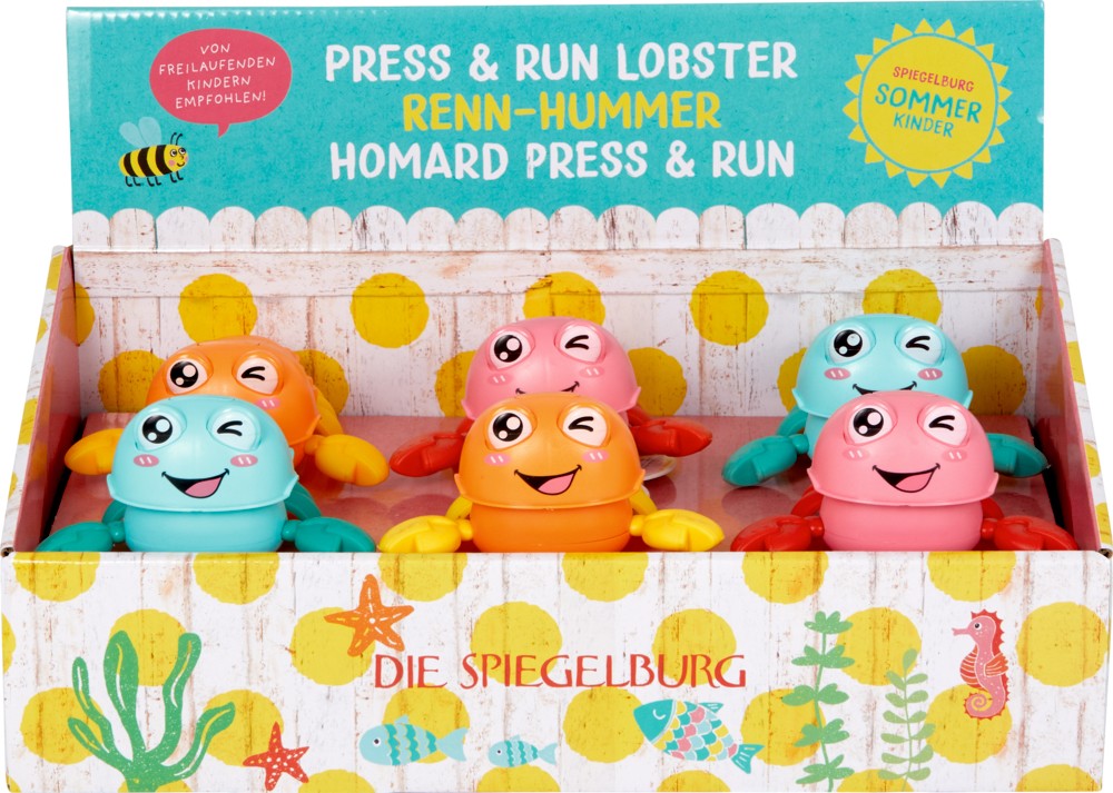 Der Renn-Hummer aus der Sommerkinder-Kollektion von Die Spiegelburg verspricht Spielspaß für Groß und Klein! Mit einem einfachen Druck auf seinen Körper saust der bunte Hummer blitzschnell los und sorgt für aufregende Rennen im Garten oder auf dem Wohnzimmerboden. Gefertigt aus robustem Kunststoff und mit einer handlichen Größe von ca. 11 x 6 x 8 cm ist er der ideale Begleiter für aktive Kinder und ihre Freunde. Das farbenfrohe Design und die einfache Handhabung machen ihn zum perfekten Spielzeug, das nicht nur Spaß bringt, sondern auch zu kleinen Wettbewerben einlädt: Wer gewinnt das große Hummer-Rennen? Ein echter Hit für kleine und große Sommerkinder! In 3 Designs erhältlich. Der Preis gilt pro Stück. Leider keine individuelle Farbauswahl möglich.