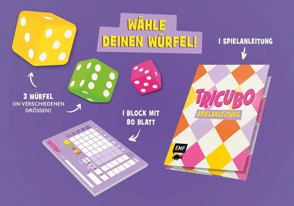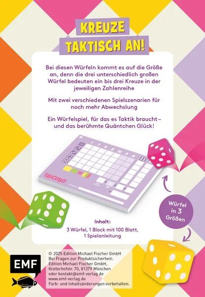 • Inhalt: Anleitungsheft, 3 Würfel, 2 Blöcke mit je 50 Blatt